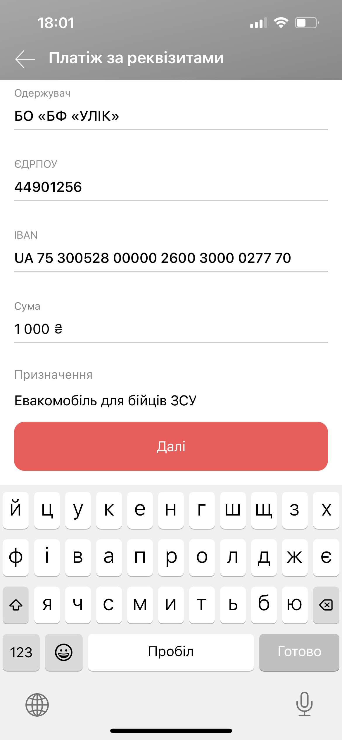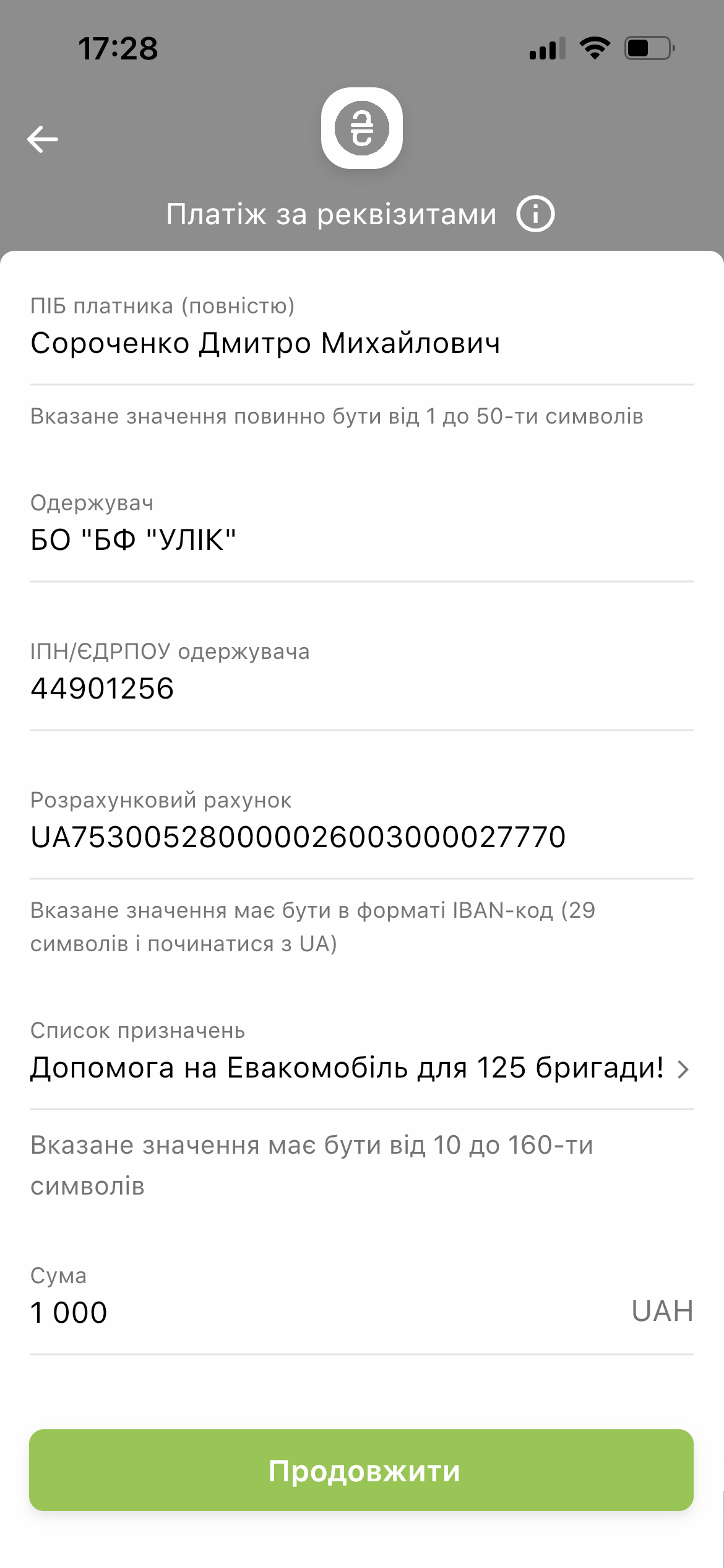 Реквізити переказу з карти іноземного банку на рахунок фонду